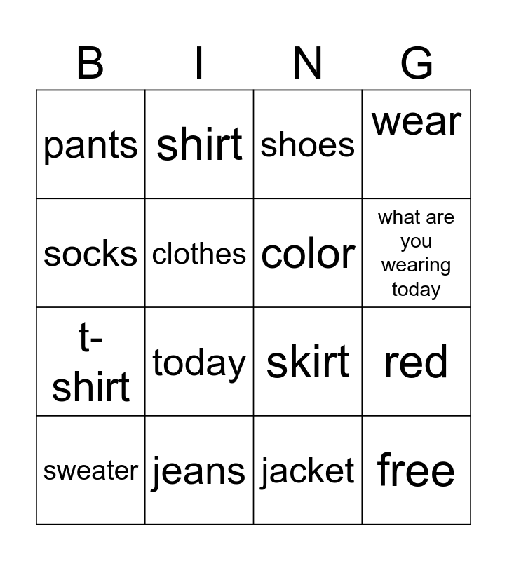 This bingo card has 16 words: jeans, red, shoes, pants, t-shirt, shirt, skirt, jacket, socks, clothes, sweater, wear, today, what are you wearing today, color and free.