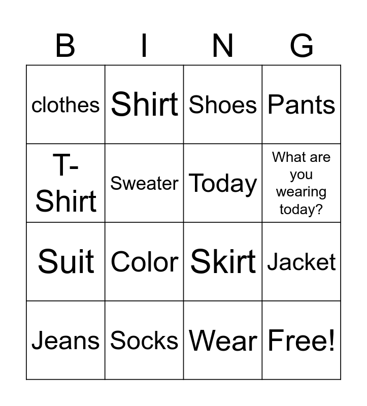 This bingo card has 16 words: Jeans, Socks, Shoes, Pants, T-Shirt, Shirt, Skirt, Jacket, clothes, Sweater, Wear, What are you wearing today?, Suit, Color, Today and Free!.