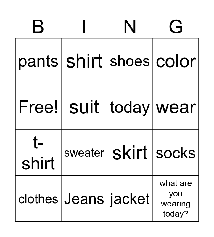 This bingo card has 16 words: Jeans, socks, shoes, pants, t-shirt, shirt, skirt, jacket, Free!, suit, clothes, color, sweater, wear, today and what are you wearing today?.