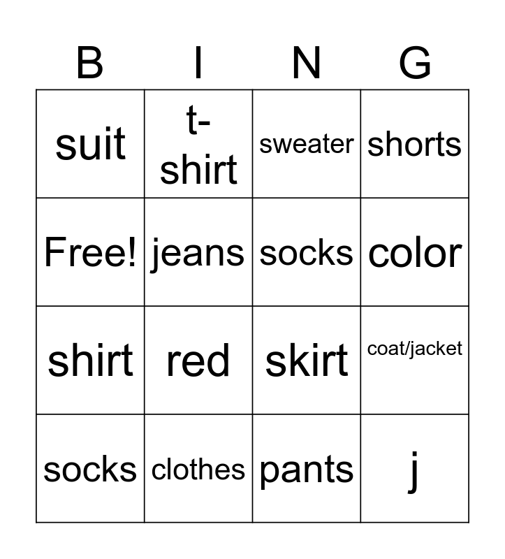 This bingo card has 16 words: clothes, coat/jacket, sweater, suit, shirt, t-shirt, skirt, pants, Free!, jeans, socks, shorts, red, color, socks and j.