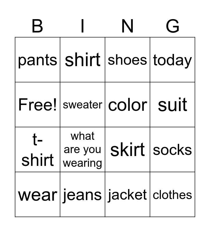 This bingo card has 16 words: jeans, socks, shoes, pants, t-shirt, shirt, skirt, jacket, Free!, sweater, wear, today, what are you wearing, suit, color and clothes.