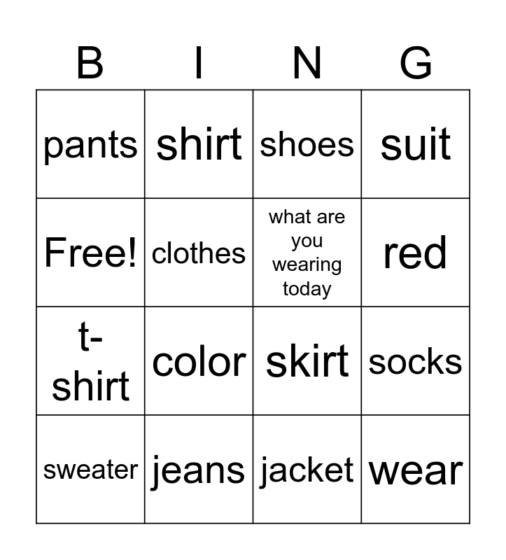 This bingo card has 16 words: jeans, socks, shoes, pants, t-shirt, shirt, skirt, jacket, Free!, clothes, sweater, suit, color, red, what are you wearing today and wear.