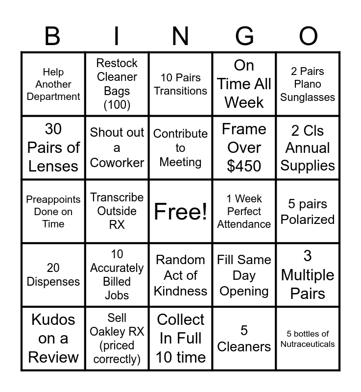 This bingo card has a free space and 28 words: 3 Multiple Pairs, Single Pair Over $800, Frame Over $450, 5 Cleaners, 30 Pairs of Lenses, 10 Pairs Transitions, Restock Cleaner Bags (100), 20 Dispenses, 1 Week Perfect Attendance, Kudos on a Review, Preappoints Done on Time, On Time All Week, Sell Oakley RX (priced correctly), Collect In Full 10 time, 2 Cls Annual Supplies, CE Credit (1), 10 Accurately Billed Jobs, Shout out a Coworker, Contribute to Meeting, Random Act of Kindness, Help Another Department, 3 Computer or Workspace, 5 bottles of Nutraceuticals, Transcribe Outside RX, 5 pairs Polarized, Fill Same Day Opening, 2 Pairs Plano Sunglasses and $1500 Sale.