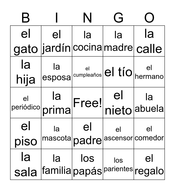This bingo card has a free space and 24 words: la mascota, la familia, el cumpleaños, la sala, la calle, el gato, la hija, el jardín, el nieto, el padre, el tío, el periódico, el ascensor, el comedor, la esposa, los parientes, la abuela, la cocina, el hermano, la prima, el regalo, el piso, la madre and los papás.