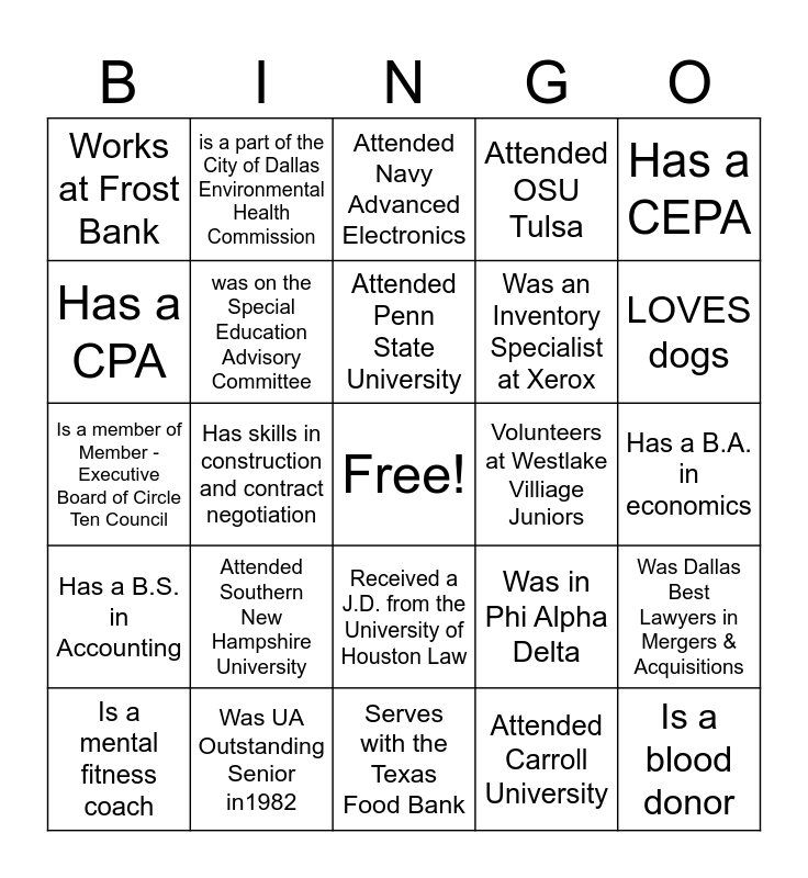 This bingo card has a free space and 41 words: Was a Law Clerk for the Texas Supreme Court, Is a member of Member - Executive Board of Circle Ten Council, Is a certified tax coach, was on the Special Education Advisory Committee, Was UA Outstanding Senior in1982, Received a J.D. from the University of Houston Law, Attended Penn State University, Has a BA in Chemistry, Has a CEPA, Has a B.S. in Accounting, Has skills in construction and contract negotiation, Attended OSU Tulsa, Is a blood donor, Has a B.A. in economics, Volunteers at Westlake Villiage Juniors, Attended Southern New Hampshire University, Spoke at Power of Habits event in Dallas, Works at Frost Bank, Is a Native Spanish Speaker, Attended Navy Advanced Electronics, Was Dallas Best Lawyers in Mergers & Acquisitions, Has a M.B.A. from Loyola Marymount University, Serves with the Texas Food Bank, Was an Inventory Specialist at Xerox, Played lacrosse in college, Was in the Dallas Business Journal 40 under 40, Attended Carroll University, Is a podcast host, LOVES dogs, Lived in Corpus Christi, Was a talk show host, is a part of the City of Dallas Environmental Health Commission, Is a mental fitness coach, is a certified beer server, Was in Phi Alpha Delta, Has a CPA, Volunteers with Social Venture Partners Dallas, Someone who's great grandfather served in the Spanish American War, Was in Delta Zeta, Has a "How to be a Positive Leader" LinkedIn certification and Is a session member at First Presbyterian Church.