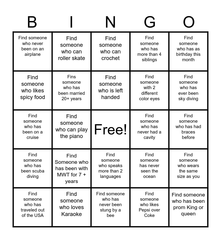 This bingo card has a free space and 24 words: Find Someone who has been with MWT for 7 + years, Find someone who loves Karaoke, Find someone who is left handed, Find someone who has traveled out of the USA, Find someone who has as birthday this month, Find someone who never been on an airplane, Find someone who likes spicy food, Find someone who can roller skate, Find someone who has never had a cavity, Find someone who speaks more than 2 languages, Find someone with 2 different color eyes, Find someone who has been on a cruise, Find someone has never seen the ocean, Find someone who wears the same size as you, Fins someone who has been married 20+ years, Find someone who likes Pepsi over Coke, Find someone who has had braces before, Find someone who can crochet, Find someone who has ever been sky diving, Find someone who can play the piano, Find someone who has been prom King or queen, Find someone who has been scuba diving, Find someone who has more than 4 siblings and Find someone who has never been stung by a bee.