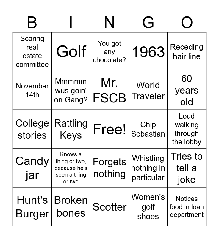 This bingo card has a free space and 31 words: Scotter, Darth Darla, Rattling Keys, Aimlessly jingling coins in his pocket, Scaring real estate committee, You got any chocolate?, Mmmmm wus goin' on Gang?, Whistling nothing in particular, Chip Sebastian, Women's golf shoes, Loud walking through the lobby, Notices food in loan department, "Don't tell my wife I'm eating this", I'm on a diet., 60 years old, Tells an old story, Tries to tell a joke, Knows a thing or two, because he's seen a thing or two, Candy jar, Forgets nothing, Receding hair line, Tobacco chew, Hunt's Burger, Golf, World Traveler, November 14th, 1963, College stories, Broken bones, Mr. FSCB and Pig Kisser.