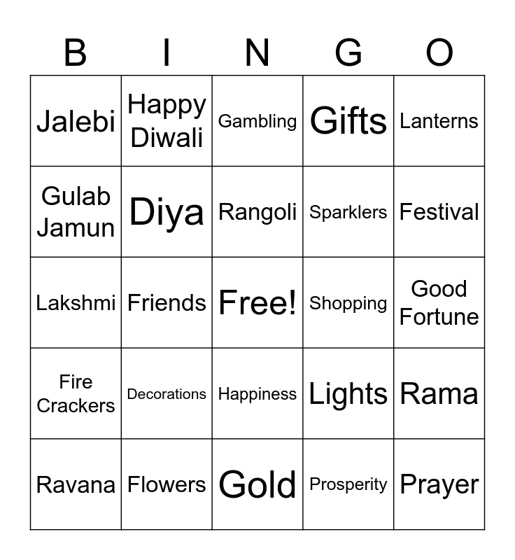 This bingo card has a free space and 26 words: Happiness, Prosperity, Rangoli, Flowers, Lanterns, Jalebi, Gulab Jamun, Happy Diwali, Good Fortune, Lights, Sparklers, Lakshmi, Rama, Ravana, Friends, Family, Gifts, Fire Crackers, Gambling, Prayer, Festival, Gold, Shopping, Decorations, Diya and Music.