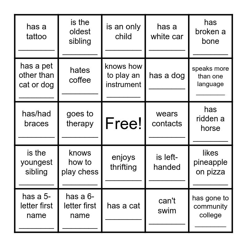 This bingo card has a free space and 27 words: is left-handed ________, likes to bake ________, has a dog ________, has a cat ________, has a pet other than cat or dog ________, is an only child ________, is the oldest sibling ________, is the youngest sibling ________, wears contacts ________, likes pineapple on pizza ________, has/had braces ________, has a white car ________, has a 5-letter first name ________, has a 6-letter first name ________, speaks more than one language ________, was born outside of NC ________, hates coffee ________, knows how to play an instrument ________, knows how to play chess ________, has a tattoo ________, has ridden a horse ________, can't swim ________, goes to therapy ________, has gone to community college ________, enjoys thrifting ________, has broken a bone ________ and was raised by a single parent ________.