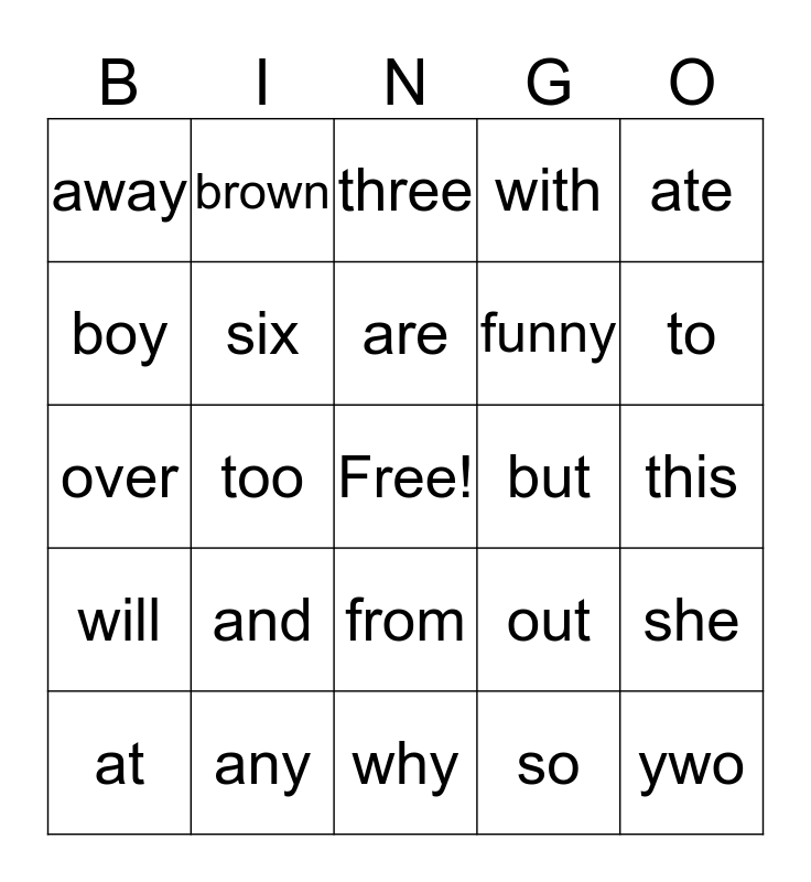 This bingo card has a free space and 24 words: and, any, are, at, ate, away, boy, brown, but, from, funny, over, out, she, six, so, this, three, to, too, ywo, will, with and why.