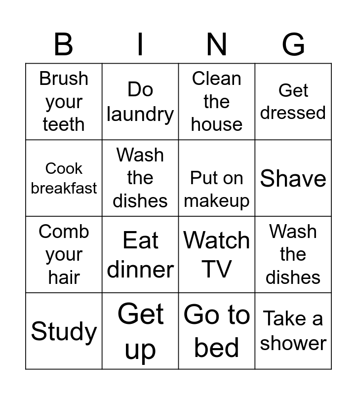 This bingo card has 16 words: Get up, Wash the dishes, Clean the house, Brush your teeth, Comb your hair, Do laundry, Watch TV, Go to bed, Cook breakfast, Wash the dishes, Study, Get dressed, Eat dinner, Shave, Put on makeup and Take a shower.