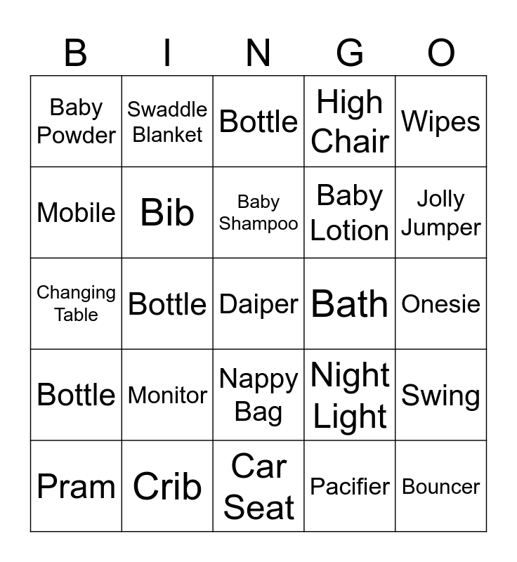 This bingo card has 25 words: Bottle, Crib, Daiper, Pacifier, Wipes, Baby Powder, Swaddle Blanket, Bottle, Bath, Swing, Mobile, Bib, Car Seat, Night Light, Jolly Jumper, Pram, Bottle, Baby Shampoo, Baby Lotion, Onesie, Changing Table, Monitor, Nappy Bag, High Chair and Bouncer.