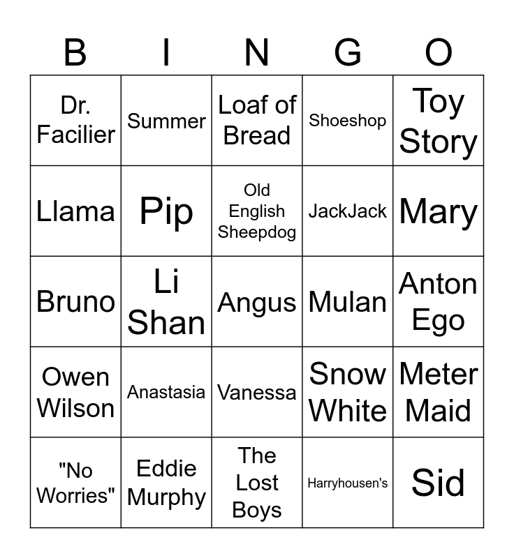 This bingo card has a free space and 34 words: Candlestick, Harryhousen's, Coral, Melody, Owen Wilson, Pip, Toy Story, "No Worries", Summer, Phil, Old English Sheepdog, Loaf of Bread, Midnight, Frying Pan, Mulan, Mary, Eddie Murphy, Bruno, Anastasia, Snow White, Vanessa, Maleficent, Dr. Facilier, Anton Ego, The Lost Boys, Sid, Shoeshop, Zazu, JackJack, Llama, Tefiti, Li Shan, Meter Maid and Joy.
