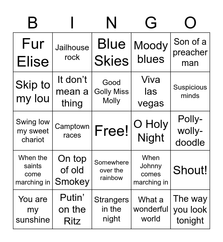 This bingo card has a free space and 29 words: You are my sunshine, Auld lang Syne, Camptown races, Can’t help falling in love, Fur Elise, Blue Skies, It don’t mean a thing, On top of old Smokey, O Holy Night, Putin’ on the Ritz, Polly-wolly-doodle, The way you look tonight, Strangers in the night, What a wonderful world, Suspicious minds, Go down, Moses, Somewhere over the rainbow, When the saints come marching in, Son of a preacher man, Swing low my sweet chariot, When Johnny comes marching in, Take me home country roads, Viva las vegas, Skip to my lou, Moody blues, Jailhouse rock, Shout!, Good Golly Miss Molly and Rock Around the Clock.