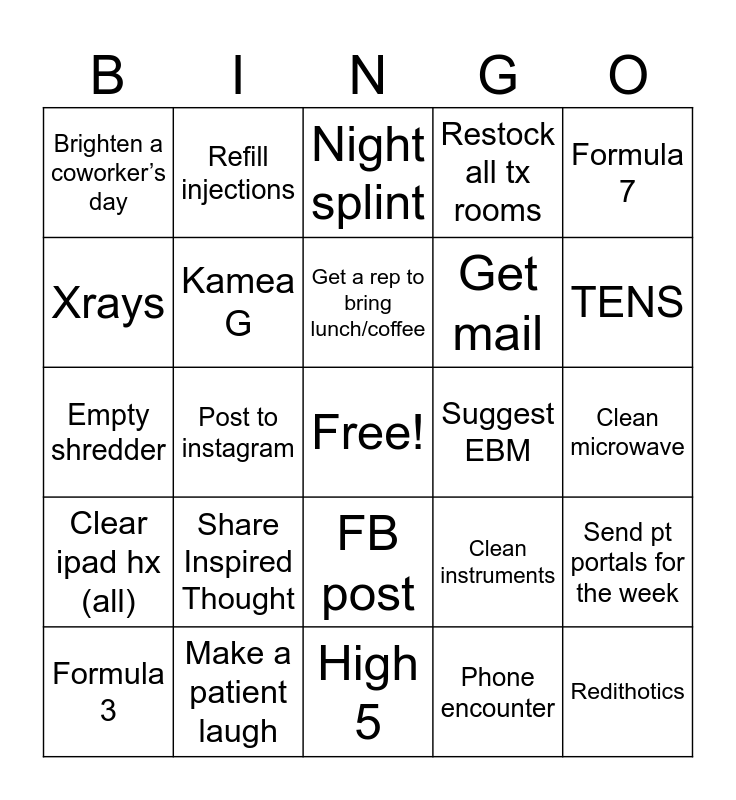 This bingo card has a free space and 29 words: Formula 3, Reload dremel bits, Post to instagram, Teach stretching exercises for PF, Brighten a coworker’s day, Night splint, Kamea G, Share Inspired Thought, Suggest EBM, Make a patient laugh, Clean microwave, Redithotics, High 5, Phone encounter, TENS, Get Google review, FB post, Clear ipad hx (all), Formula 7, Empty shredder, Clean instruments, Sweep, Get mail, Xrays, Restock all tx rooms, Refill injections, Send pt portals for the week, Get a rep to bring lunch/coffee and Get to work 10 minutes early.