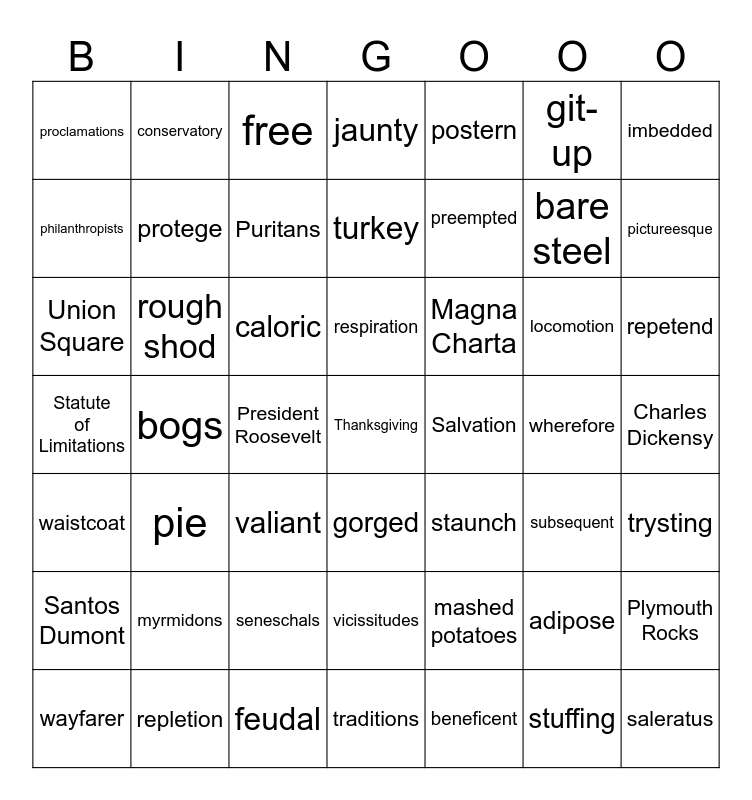 This bingo card has 49 words: adipose, bare steel, beneficent, bogs, caloric, Charles Dickensy, conservatory, feudal, git-up, gorged, imbedded, jaunty, locomotion, Magna Charta, myrmidons, wherefore, philanthropists, pictureesque, Plymouth Rocks, postern, preempted, President Roosevelt, proclamations, protege, wayfarer, Puritans, repetend, repletion, respiration, rough shod, saleratus, Salvation, Santos Dumont, seneschals, Statute of Limitations, staunch, subsequent, trysting, Union Square, valiant, vicissitudes, waistcoat, Thanksgiving, traditions, turkey, free, mashed potatoes, pie and stuffing.