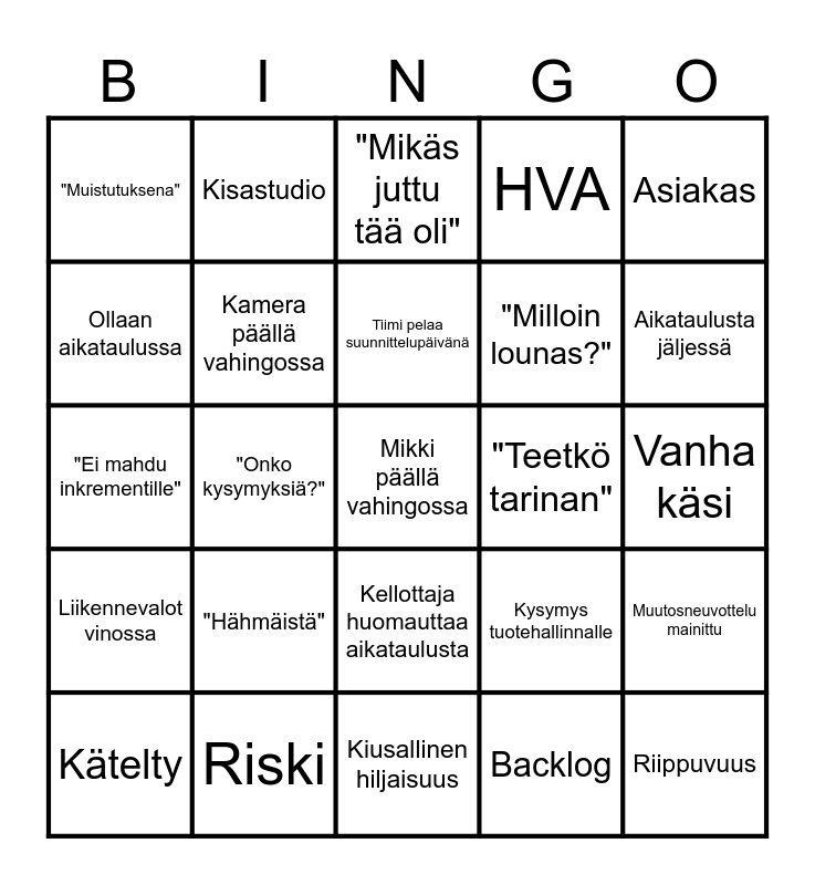 This bingo card has 25 words: "Hähmäistä", Kiusallinen hiljaisuus, Tiimi pelaa suunnittelupäivänä, Kätelty, Asiakas, "Muistutuksena", Ollaan aikataulussa, Kisastudio, "Teetkö tarinan", Kellottaja huomauttaa aikataulusta, "Milloin lounas?", "Ei mahdu inkrementille", Kysymys tuotehallinnalle, Muutosneuvottelu mainittu, Kamera päällä vahingossa, Riippuvuus, Vanha käsi, "Mikäs juttu tää oli", Aikataulusta jäljessä, "Onko kysymyksiä?", Mikki päällä vahingossa, Riski, Liikennevalot vinossa, HVA and Backlog.