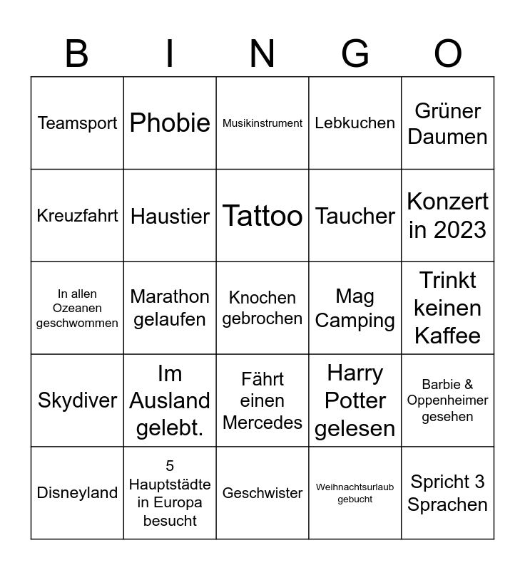 This bingo card has 25 words: Im Ausland gelebt., Geschwister, Tattoo, Disneyland, Grüner Daumen, Teamsport, Kreuzfahrt, Phobie, Mag Camping, Fährt einen Mercedes, Taucher, In allen Ozeanen geschwommen, Harry Potter gelesen, Barbie & Oppenheimer gesehen, Haustier, Spricht 3 Sprachen, Trinkt keinen Kaffee, Musikinstrument, Konzert in 2023, Marathon gelaufen, Knochen gebrochen, 5 Hauptstädte in Europa besucht, Skydiver, Lebkuchen and Weihnachtsurlaub gebucht.