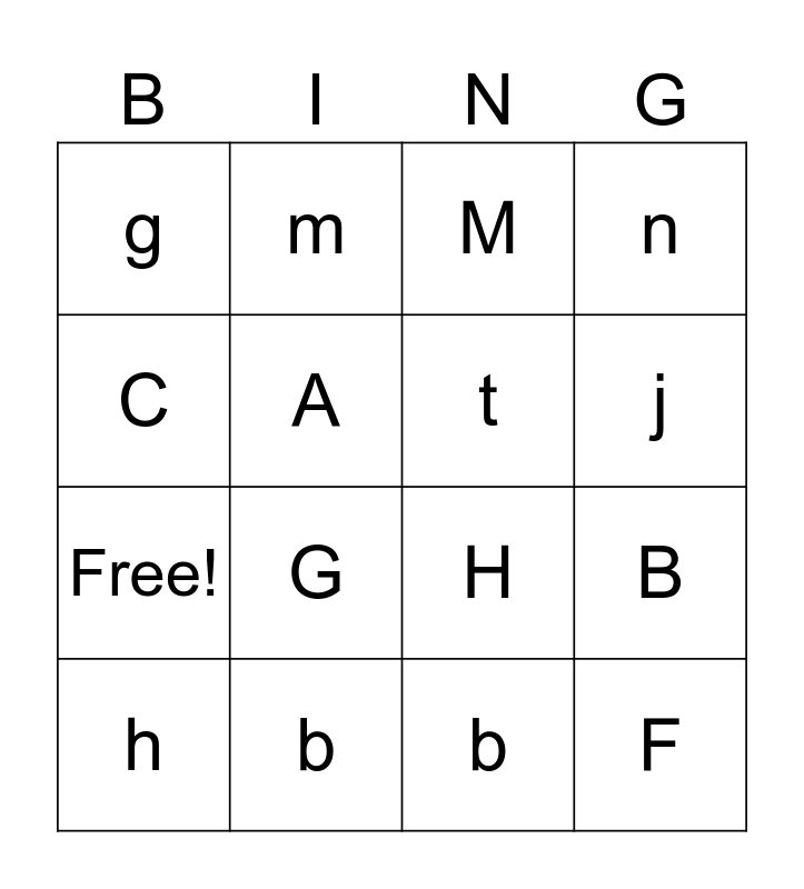 This bingo card has 20 words: B, T, M, f, h, C, b, g, Free!, m, G, H, A, F, t, o, j, n, b and d.