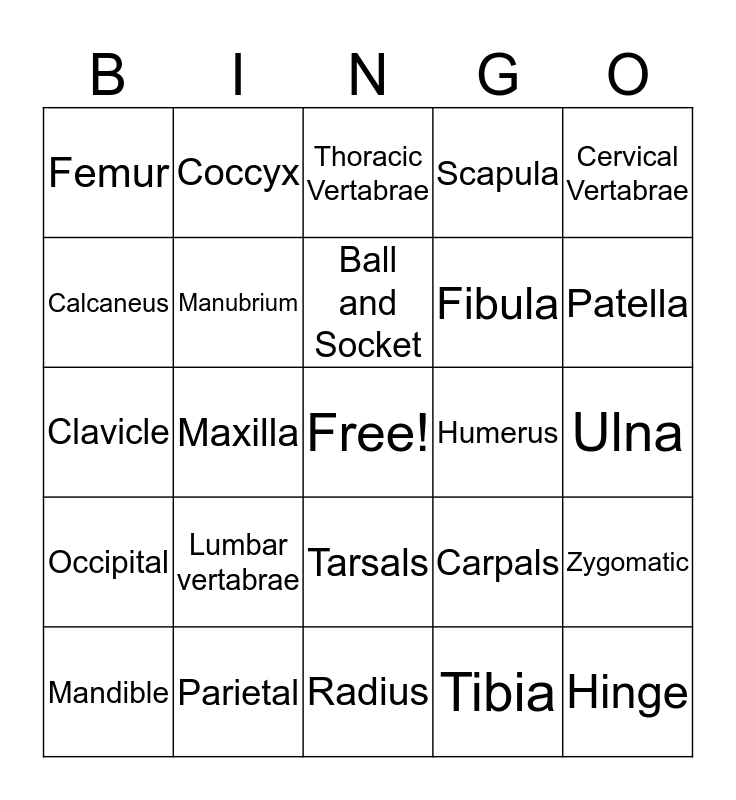 This bingo card has a free space and 24 words: Lumbar vertabrae, Parietal, Ball and Socket, Mandible, Cervical Vertabrae, Femur, Calcaneus, Coccyx, Humerus, Tarsals, Fibula, Clavicle, Carpals, Zygomatic, Manubrium, Tibia, Ulna, Thoracic Vertabrae, Patella, Maxilla, Hinge, Occipital, Scapula and Radius.