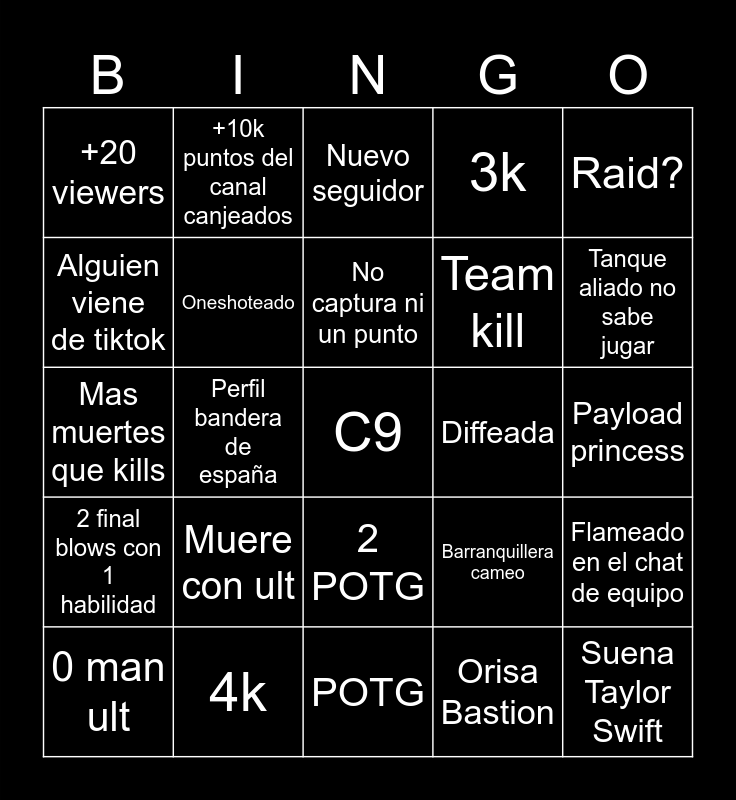 This bingo card has a free space and 24 words: Muere con ult, 4k, No captura ni un punto, 0 man ult, Raid?, +20 viewers, Alguien viene de tiktok, +10k puntos del canal canjeados, Diffeada, 2 POTG, Team kill, Mas muertes que kills, Barranquillera cameo, Flameado en el chat de equipo, Oneshoteado, Orisa Bastion, Payload princess, Nuevo seguidor, Tanque aliado no sabe jugar, Perfil bandera de españa, Suena Taylor Swift, 2 final blows con 1 habilidad, 3k and POTG.