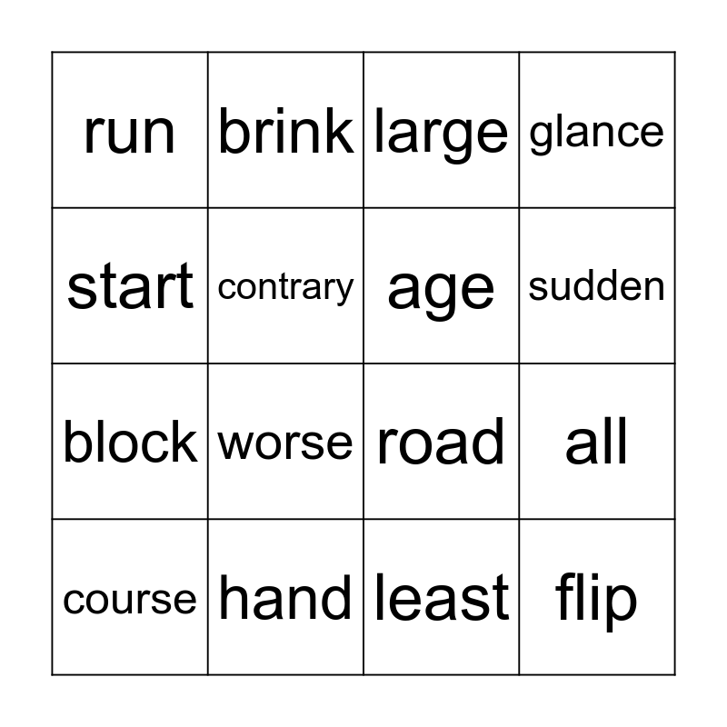 This bingo card has 16 words: hand, all, large, run, block, brink, road, least, start, contrary, course, glance, worse, sudden, age and flip.