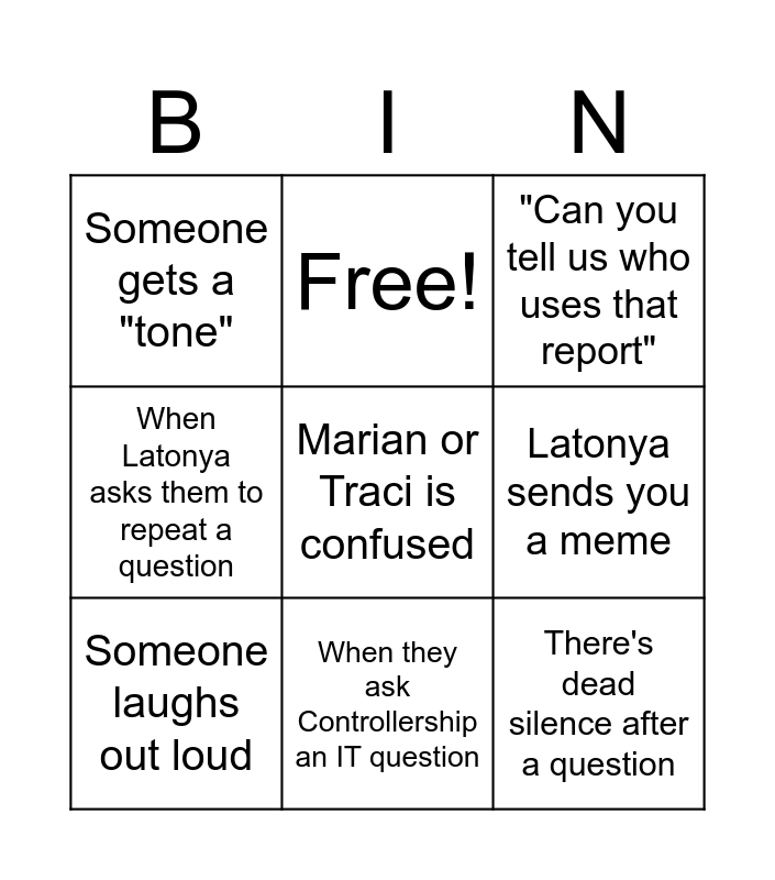 This bingo card has 12 words: Someone asks an overly generic question, There's dead silence after a question, Marian or Traci is confused, Latonya sends you a meme, Free!, "Can you tell us who uses that report", When they ask Controllership an IT question, When they ask us a bank question we can't answer, Someone gets a "tone", When Latonya asks them to repeat a question, Someone laughs out loud and When Latonya pings you.