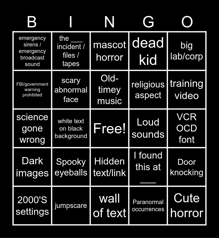 This bingo card has a free space and 60 words: Bad Vhs effect, jumpscare, text over filter, Loud sounds, bad audio mixing, text to voice, scary abnormal face, Censor bars, dead kid, doppelganger trope, FBI/government warning prohibited, broadcast interruptions, Old-timey music, Morse code, inconsistent aspect ratio, emergency sirens / emergency broadcast sound, white text on black background, mascot horror, telephone call, training video, science gone wrong, the ___ incident / files / tapes, TV static, I found this at ___, unexplained glitches, news station, clearly a teenager doing an adult voice, boring car ride scene, religious aspect, analog to live action, AI images/voices, screaming then crunch, Mandela rip off, local 58 rip off, big lab/corp, 2000'S settings, puppets, wall of text, CGI passing off as live action, VCR OCD font, go/stay inside now, Spooky eyeballs, Hidden text/link, bad voice acting, Cute horror, Slideshow horror, Transformation horror, Distorted Audio, Skin walkers, Door knocking, Dark images, Redacted, Zombie, Parasites, God or Cosmic like beings, Typos, Gemini ripoff, PSA, Paranormal occurrences and FNAF.