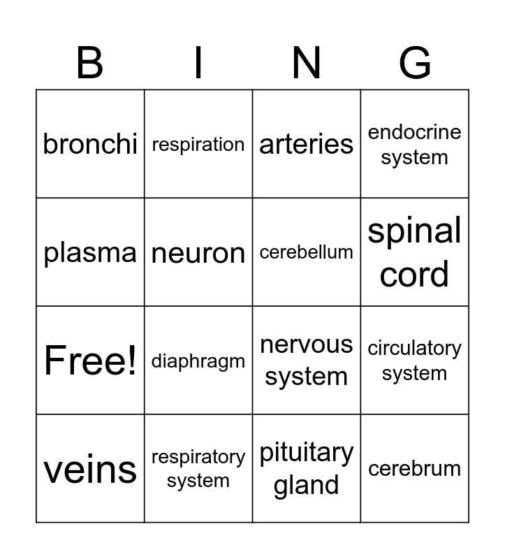 This bingo card has 20 words: circulatory system, heart, arteries, capillaries, veins, plasma, respiratory system, bronchi, Free!, respiration, diaphragm, nervous system, neuron, cerebrum, cerebellum, brain stem, spinal cord, endocrine system, pituitary gland and thyroid hormone.