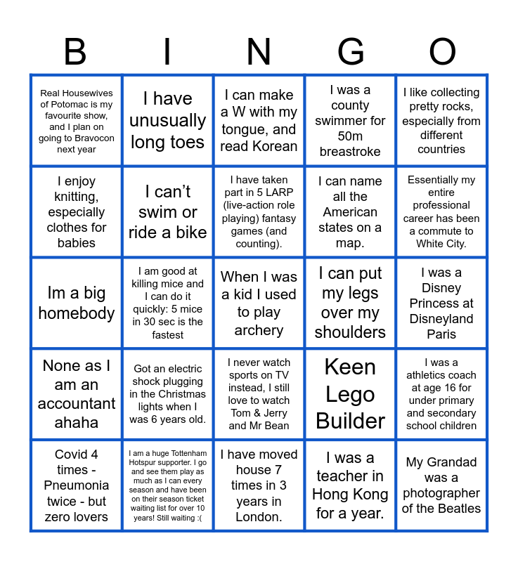 This bingo card has 25 words: None as I am an accountant ahaha, I am a huge Tottenham Hotspur supporter. I go and see them play as much as I can every season and have been on their season ticket waiting list for over 10 years! Still waiting :(, When I was a kid I used to play archery, I was a teacher in Hong Kong for a year., I like collecting pretty rocks, especially from different countries, Real Housewives of Potomac is my favourite show, and I plan on going to Bravocon next year, I have unusually long toes, I can make a W with my tongue, and read Korean, I can put my legs over my shoulders, I was a athletics coach at age 16 for under primary and secondary school children, I enjoy knitting, especially clothes for babies, I can’t swim or ride a bike, I have moved house 7 times in 3 years in London., Keen Lego Builder, Essentially my entire professional career has been a commute to White City., Covid 4 times - Pneumonia twice - but zero lovers, I am good at killing mice and I can do it quickly: 5 mice in 30 sec is the fastest, I have taken part in 5 LARP (live-action role playing) fantasy games (and counting)., I can name all the American states on a map., I was a Disney Princess at Disneyland Paris, Im a big homebody, Got an electric shock plugging in the Christmas lights when I was 6 years old., I never watch sports on TV instead, I still love to watch Tom & Jerry and Mr Bean, I was a county swimmer for 50m breastroke and My Grandad was a photographer of the Beatles.