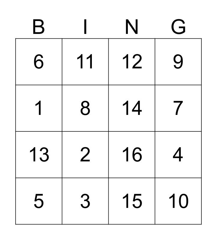 This bingo card has a free space and 15 words: 5, 10, 12, 6, 7, 1, 2, 15, 8, 13, 4, 9, 14, 11 and 3.