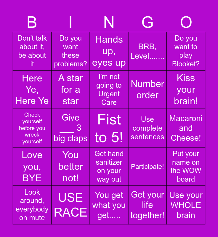 This bingo card has a free space and 24 words: You better not!, USE RACE, I'm not going to Urgent Care, Look around, everybody on mute, Do you want to play Blooket?, Don't talk about it, be about it, Here Ye, Here Ye, Do you want these problems?, Use complete sentences, Get hand sanitizer on your way out, Number order, Check yourself before you wreck yourself, Participate!, Put your name on the WOW board, A star for a star, Get your life together!, Macaroni and Cheese!, Hands up, eyes up, Kiss your brain!, Give ___ 3 big claps, Use your WHOLE brain, Love you, BYE, BRB, Level....... and You get what you get......