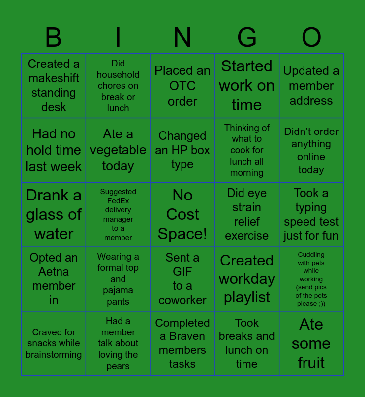 This bingo card has a free space and 24 words: Wearing a formal top and pajama pants, Had a member talk about loving the pears, Changed an HP box type, Craved for snacks while brainstorming, Updated a member address, Created a makeshift standing desk, Had no hold time last week, Did household chores on break or lunch, Did eye strain relief exercise, Sent a GIF to a coworker, Thinking of what to cook for lunch all morning, Drank a glass of water, Created workday playlist, Cuddling with pets while working (send pics of the pets please ;)), Ate a vegetable today, Took breaks and lunch on time, Took a typing speed test just for fun, Placed an OTC order, Didn’t order anything online today, Suggested FedEx delivery manager to a member, Ate some fruit, Opted an Aetna member in, Started work on time and Completed a Braven members tasks.