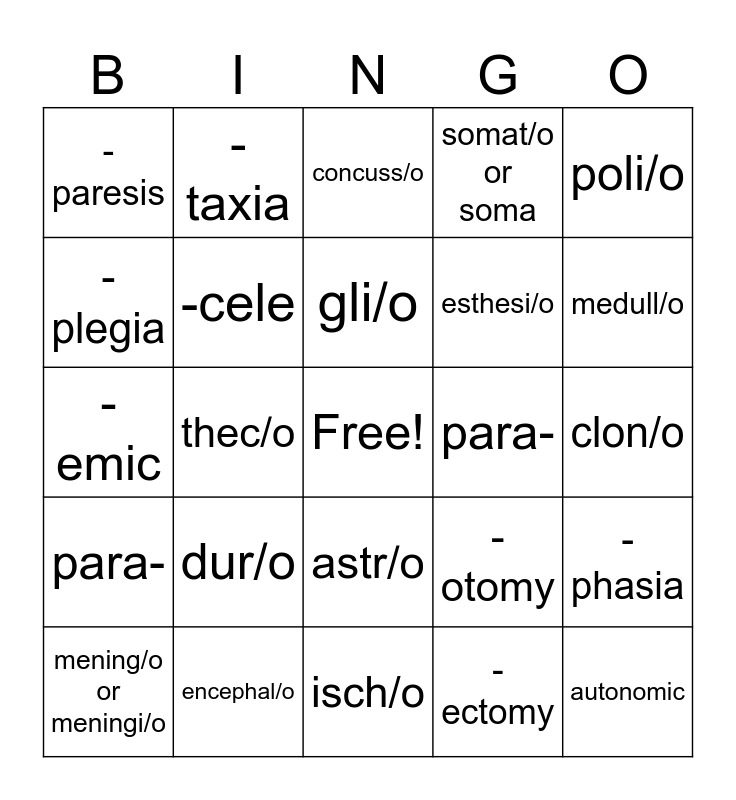 This bingo card has a free space and 24 words: dur/o, encephal/o, gli/o, mening/o or meningi/o, poli/o, -paresis, -plegia, -taxia, para-, astr/o, esthesi/o, -emic, -otomy, -phasia, -cele, -ectomy, clon/o, concuss/o, medull/o, thec/o, autonomic, para-, somat/o or soma and isch/o.