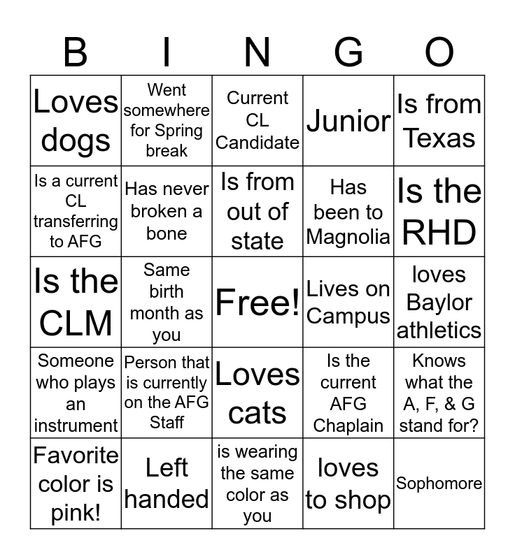 This bingo card has a free space and 24 words: Person that is currently on the AFG Staff, Left handed, Is from out of state, Favorite color is pink!, Is from Texas, Loves dogs, Is a current CL transferring to AFG, Went somewhere for Spring break, Lives on Campus, Loves cats, Has been to Magnolia, Is the CLM, Is the current AFG Chaplain, Knows what the A, F, & G stand for?, Has never broken a bone, loves to shop, loves Baylor athletics, Current CL Candidate, Is the RHD, Same birth month as you, Sophomore, Someone who plays an instrument, Junior and is wearing the same color as you.
