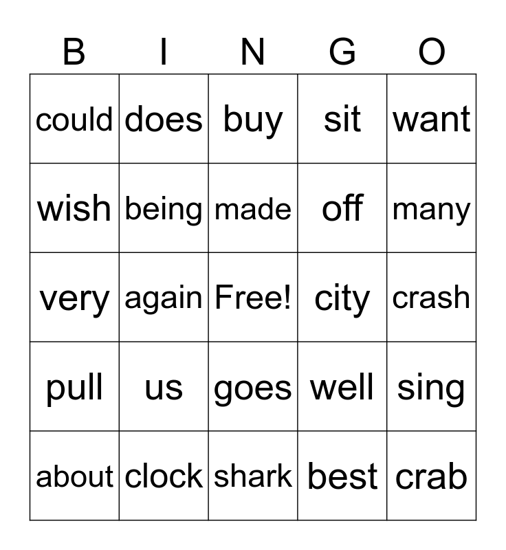 This bingo card has a free space and 29 words: about, above, again, body, could, buy, being, us, city, clock, crash, crab, shark, best, many, write, goes, pull, want, very, well, turn, off, wish, sit, does, sing, made and fast.