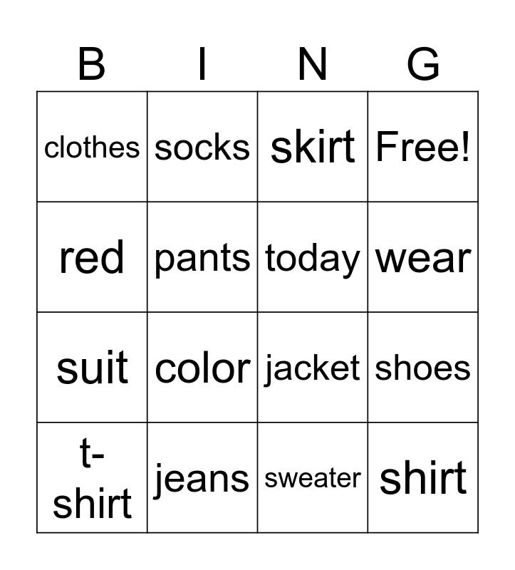This bingo card has 16 words: jeans, shoes, skirt, clothes, suit, socks, jacket, sweater, red, pants, t-shirt, Free!, color, wear, today and shirt.