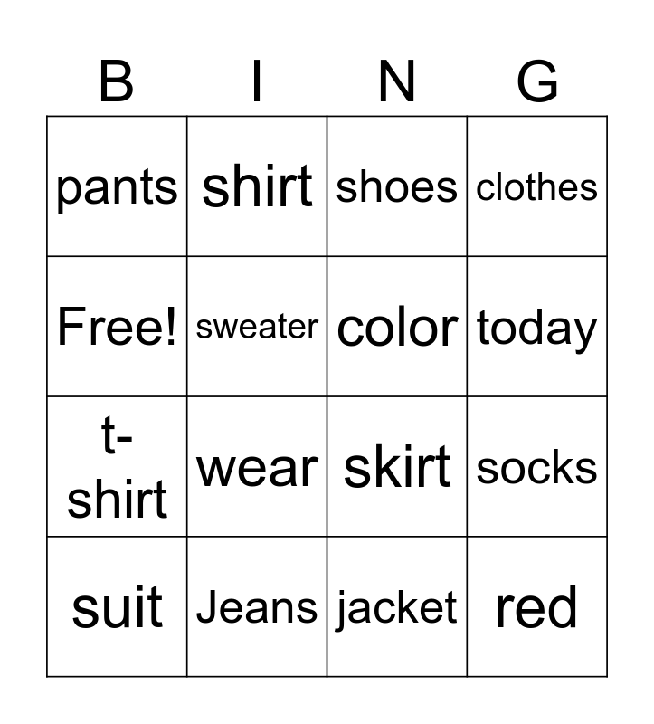 This bingo card has 16 words: Jeans, socks, shoes, pants, t-shirt, shirt, skirt, jacket, Free!, sweater, suit, clothes, wear, today, color and red.
