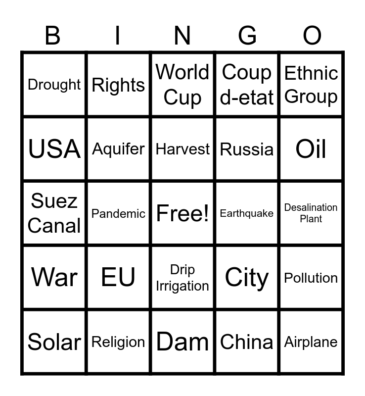 This bingo card has a free space and 24 words: EU, Religion, Harvest, Solar, Ethnic Group, Drought, USA, Rights, Earthquake, Drip Irrigation, Russia, Suez Canal, City, Pollution, Aquifer, China, Desalination Plant, World Cup, Oil, Pandemic, Airplane, War, Coup d-etat and Dam.