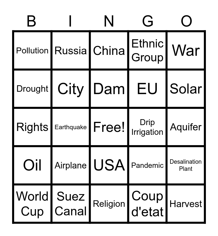 This bingo card has a free space and 24 words: Airplane, Suez Canal, Dam, World Cup, War, Pollution, Drought, Russia, Drip Irrigation, USA, EU, Rights, Pandemic, Desalination Plant, City, Coup d'etat, Aquifer, China, Solar, Earthquake, Harvest, Oil, Ethnic Group and Religion.