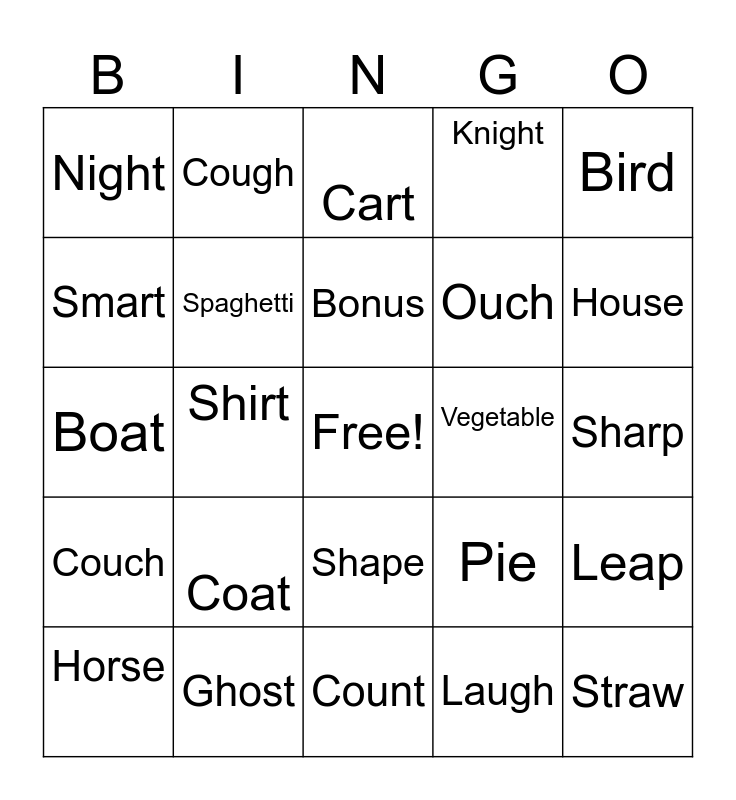 This bingo card has a free space and 29 words: Horse, Mouse, Shirt, Soil, Night, Cart, Spaghetti, Coat, Vegetable, Ghost, Sharp, Straw, Count, Laugh, House, Bought, Shape, Couch, Bird, Boat, Pie, Art, Ouch, Smart, Knight, Cough, Leap, Bonus and Mountain.