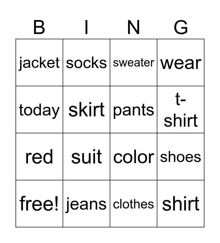 This bingo card has 16 words: jeans, shoes, sweater, jacket, red, socks, color, clothes, today, skirt, free!, wear, suit, t-shirt, pants and shirt.