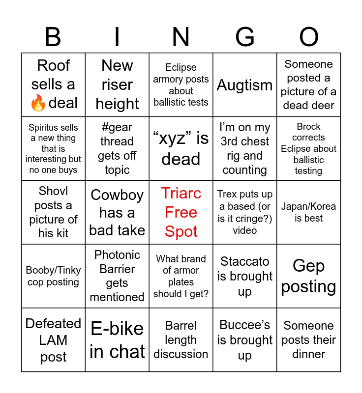 This bingo card has a free space and 24 words: Photonic Barrier gets mentioned, E-bike in chat, “xyz” is dead, Defeated LAM post, Someone posted a picture of a dead deer, Roof sells a 🔥deal, Spiritus sells a new thing that is interesting but no one buys, New riser height, Trex puts up a based (or is it cringe?) video, What brand of armor plates should I get?, I’m on my 3rd chest rig and counting, Shovl posts a picture of his kit, Staccato is brought up, Gep posting, #gear thread gets off topic, Buccee’s is brought up, Japan/Korea is best, Eclipse armory posts about ballistic tests, Brock corrects Eclipse about ballistic testing, Cowboy has a bad take, Someone posts their dinner, Booby/Tinky cop posting, Augtism and Barrel length discussion.
