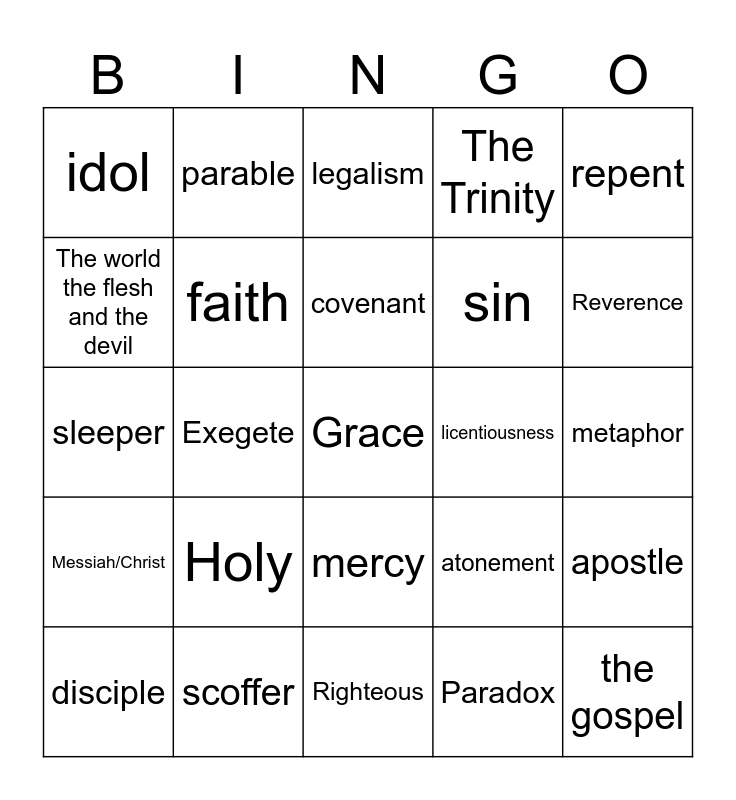 This bingo card has a free space and 24 words: disciple, Holy, covenant, Paradox, repent, idol, parable, legalism, licentiousness, metaphor, sleeper, faith, atonement, apostle, The world the flesh and the devil, scoffer, Righteous, The Trinity, Reverence, Messiah/Christ, Exegete, mercy, sin and the gospel.