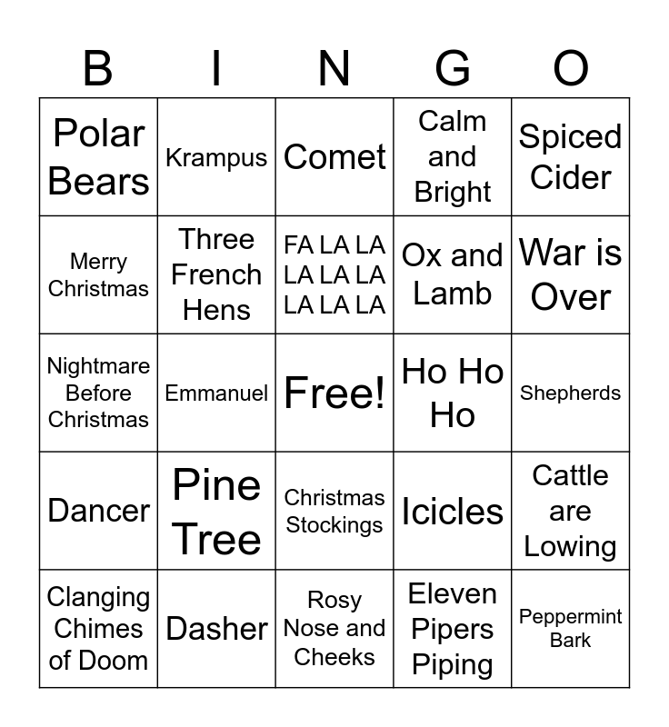 This bingo card has a free space and 120 words: Baby It's Cold Outside, Bethlehem, Blitzen, Blue Christmas, Boughs of Holly, Boxing Day, Calm and Bright, Candlelight, Cattle are Lowing, Census, Chimney, Christmas Angels, Christmas Carols, Christmas Elves, Christmas Ornaments, Christmas Star, Christmas Stockings, Christmas Toys, Christmas Vacation, Cindy Lou Who, Clanging Chimes of Doom, Comet, Crackling Fire, Cranberries, Cupid, Dancer, Dasher, Deck the Halls, Donner, Eight Maids Milking, Eleven Pipers Piping, Emmanuel, FA LA LA LA LA LA LA LA LA, Falling Snow, Feliz Navidad, Fir Tree, Five Golden Rings, Four Calling Birds, Frosty the Snowman, Garland, Gift Cards, Gingerbread Man, Hallelujah, Happy Christmas, Heatmiser, Heavenly Peace, Herald Angels, Ho Ho Ho, Holly and Ivy, Holy Infant, Holy Trinity, Hot Chocolate, Icicles, Jack Frost, Jerusalem, Jingle Bells, Joy to the World, Joyeux Noel, King of Kings, Krampus, Let It Snow, Lord Jesus, Lord of Lords, Manger, Mary Did You Know, Merry Christmas, Midnight Clear, Milk and Cookies, Mistletoe, Nakatomi Plaza, Nightmare Before Christmas, Nine Ladies Dancing, Nutcracker Ballet, Oh Christmas Tree, Olive the Other Reindeer, Opening Gifts, Ox and Lamb, Partridge in a Pear Tree, Peppermint Bark, Pine Tree, Polar Bears, Popcorn, Prancer, Prince of Peace, Ribbons and Bows, Roasting Chestnuts, Rosy Nose and Cheeks, Rudolph, Santa, Secret Santa, Seven Swans Swimming, Shepherds, Silent Night, Silver Bells, Six Geese Laying, Sleighs, Snowmiser, Spiced Cider, St Nick, Stocking Stuffers, Sugar Cookies, Sugar Plums, Ten Lords Leaping, The First Noel, The Grinch, Three French Hens, Three Wise Men, Time with Family, Tiny Tots, Twelve Days of Christmas, Twelve Dummers Drumming, Two Turtledoves, Virgin Mary, Vixen, War is Over, White Christmas, Wrapping Paper, Ya Filthy Animal, You'll Shoot Your Eye Out! and Yule Log.