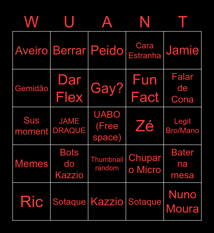 This bingo card has a free space and 49 words: Laggar, Nuno Moura, Windoh, Kazzio, Bots do Kazzio, WINDOH BINGOH, Berrar, Gemer, Gemidão, Bater Palmas, Dar Flex, Cara Estranha, Bater na mesa, Chupar o Micro, Micro Estourado, Chat diz "27 Anos", Gay?, Zé, Move, Jamie, JAME DRAQUE, Sotaque, Aveiro, Fun Fact, Falar de Pau, Falar de Cona, Ric, Calvice, Thumbnail random, Memes, Rir alto, *Wheezee*, Double LAG, Triple LAG, Sotaque, Mencionar os Pais, Casino, Pólitica, Legit Bro/Mano, André Ventura, React, Metal Pipe, Afodercomtudo, Tiagovski, Sus moment, Peido, PEIDO NUCLEAR, Madeira and Imitação do windoh (LEGIT BRO-).