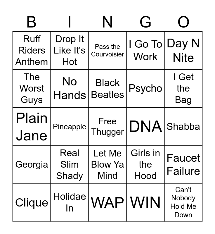 This bingo card has a free space and 119 words: Rapper's Delight, It's Tricky, Just a Friend, Friends, Fight For Your Right, Bring the Noise, I Go To Work, Bust a Move, Sound of da Police, Funky Cold Medina, Girls Aint Nothing But Trouble, Hard Times, If I Ruled the World, Mama Said Knock You Out, Ladies First, Straight Outta Compton, Let Me Blow Ya Mind, Mask Off, Behind Bars, Hustler's Anthem 09, Clique, Pass the Courvoisier, Look at Me Now, What's Your Fantasy, How Low, Georgia, Holidae In, Ante Up, My Chick Bad, Both, I Get the Bag, Black Beatles, Pineapple, SAY MY GRACE, Paint the Town Red, Like That, umean, Agora Hills, Money Trees, Hotline Bling, Lucid Dreams, Bops, Rich Flex, Rich Baby Daddy, Just Wanna Rock, Jumpman, DNA, WIN, Look Alive, WAP, Best Friend, Girls in the Hood, Twerkulator, My Type, Shabooya, So Fresh, So Clean, FNF, Knuck if you Buck, 4am, Krypotonite, Rosa Parks, Rubber Band Man, Big Things Poppin, All the Way Turnt Up, Rock Yo Hips, No Hands, Flex (Ooh, Ooh), East Atlanta Day, Psycho, Plain Jane, Me & U, Shabba, Through the Wire, Circus, Provider, Doo Woop (That Thing(, Ready or Not, Can't Nobody Hold Me Down, Real Slim Shady, Ruff Riders Anthem, Return of the Mack, Air Force Ones, Me Against the World, Small Worlds, 679, Bloom, Captain Hook, Boyz-N-The-Hood, Drop It Like It's Hot, RAF, Milly Rock, Can I Kick It?, Walk on Water, Players, Praise The Lord, Thought It Was a Drought, Day N Nite, Commas, Shoop, Where Ya At, No Flockin, 2 Phones, It's a Vibe, Bodak Yellow, Try Me, Neighbors, Get ur Freak On, Skrt, Issues, Power Trip, Texas, The Worst Guys, Sweatpants, JUICE, Collard Greens, ROXANNE, Numb Numb Juice, Faucet Failure and Lay Wit Ya.
