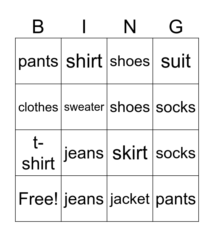 This bingo card has 16 words: jeans, socks, shoes, pants, t-shirt, shirt, skirt, jacket, clothes, sweater, Free!, suit, jeans, socks, shoes and pants.
