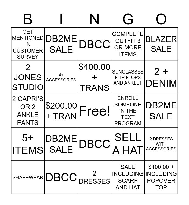 This bingo card has a free space and 24 words: DB2ME SALE, DBCC, $400.00 + TRANS, SHAPEWEAR, BLAZER SALE, GET MENTIONED IN CUSTOMER SURVEY, 2 JONES STUDIO, DB2ME SALE, ENROLL SOMEONE IN THE TEXT PROGRAM, DBCC, SUNGLASSES FLIP FLOPS AND ANKLET, 2 CAPRI'S OR 2 ANKLE PANTS, SELL A HAT, 2 DRESSES WITH ACCESSORIES, 4+ ACCESSORIES, SALE INCLUDING SCARF AND HAT, DB2ME SALE, DBCC, 2 + DENIM, $200.00 + TRAN, $100.00 + INCLUDING POPOVER TOP, 5+ ITEMS, COMPLETE OUTFIT 3 OR MORE ITEMS and 2 DRESSES.