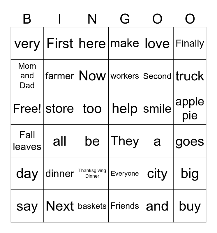 This bingo card has 36 words: Everyone, Thanksgiving Dinner, Friends, Mom and Dad, Fall leaves, help, farmer, baskets, love, city, truck, make, big, store, workers, very, day, smile, Free!, here, too, all, They, be, a, First, Second, Next, Now, Finally, buy, say, goes, apple pie, dinner and and.